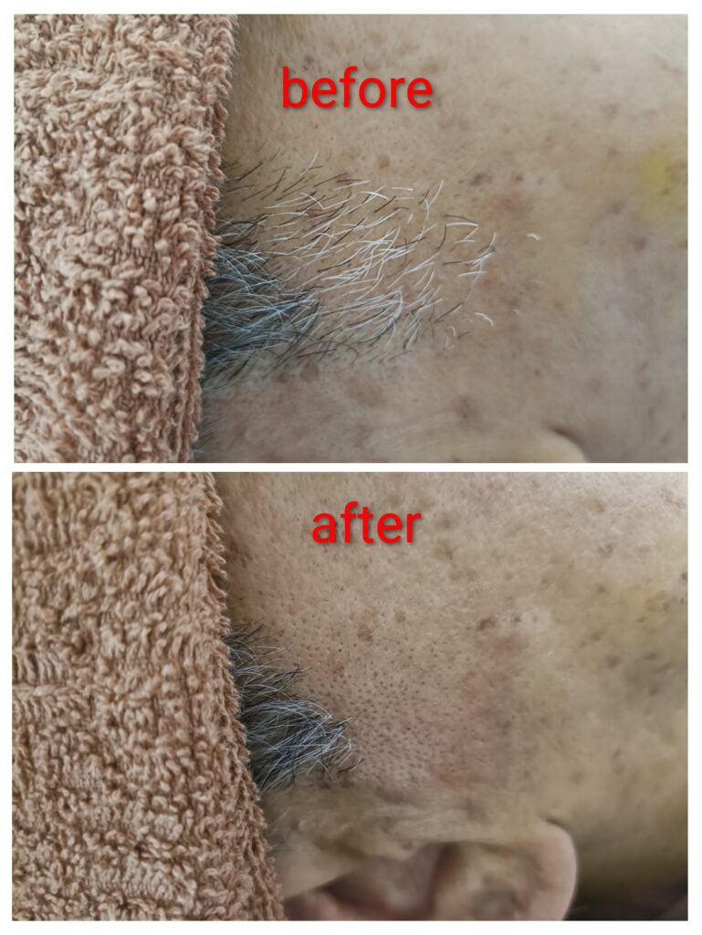 今回は、もみあげ部分の白髪や不要な毛を美容電気脱毛で丁寧に処理しました。